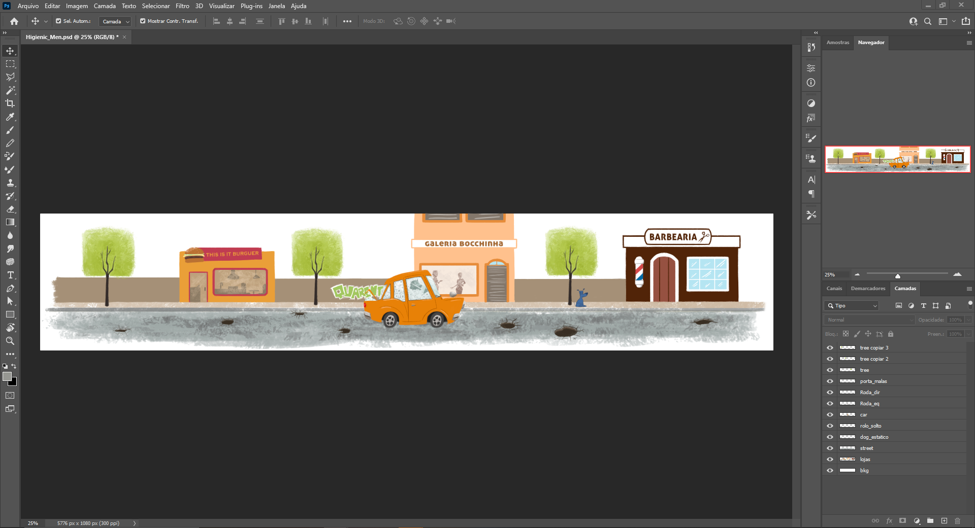 Criei todos os elementos separadamente no Photoshop, já deixando pronto para a animação. Mesmo que alguns elementos eu não fosse animar, como as árvores, eu quis criá-las separadamente para ter mais liberdade em questão de layout.